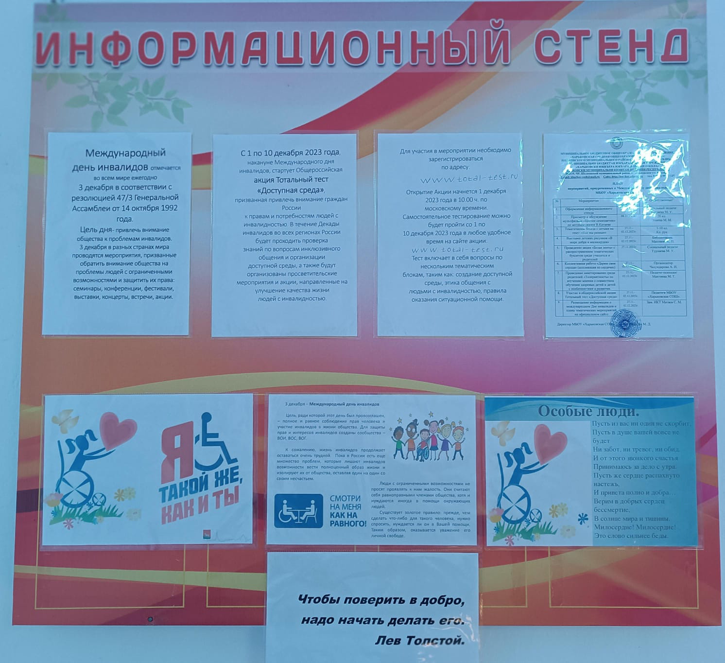 В МБОУ "ХАРЬКОВСКАЯСОШ" ОФОРМЛЕН СТЕНД "Я ТАКОЙ ЖЕ, КАК И ТЫ", ПОСВЯЩЕННЫЙ МЕЖДУНАРОДНОМУ ДНЮ ИНВАЛИДОВ, КОТОРЫЙ ОТМЕЧАЕТСЯ 3 ДЕКАБРЯ С 1992Г.