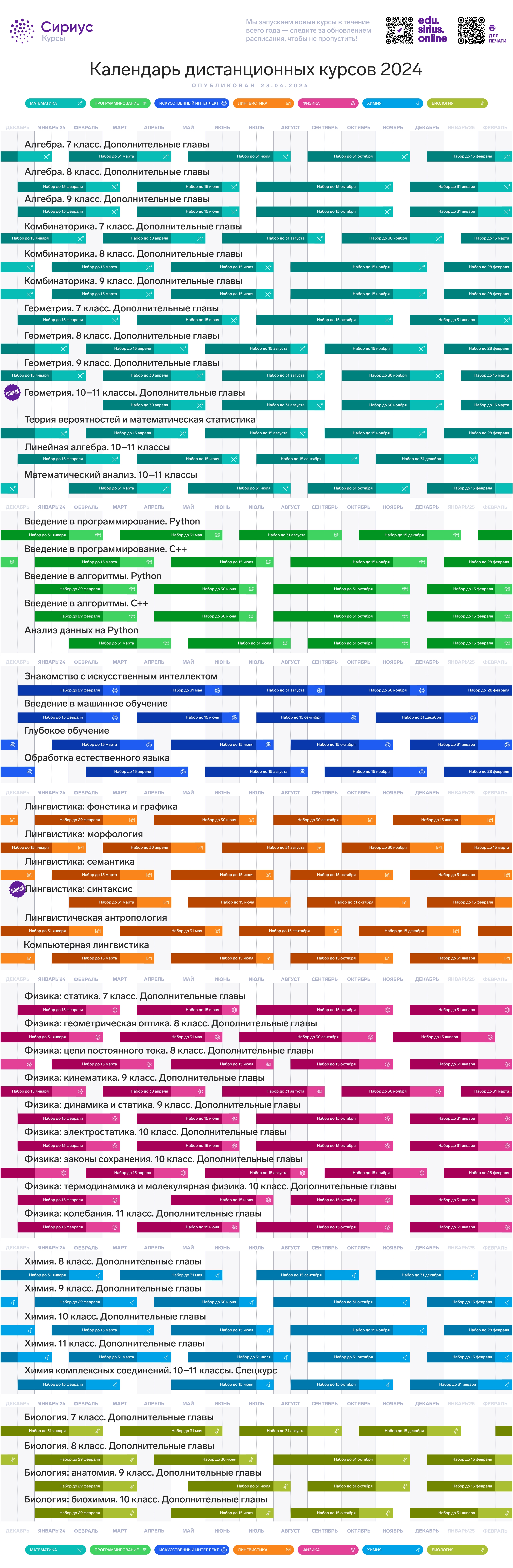 02.05.2024Онлайн-школа Сириус.Курсы опубликовала расписание курсов на 2024 год. В расписании 45 бесплатных онлайн-курсов для углублённогоизучения предметов по семи направлениям: математика,программирование, физика, химия, биология, искусственныйинтеллект и лингвистика.