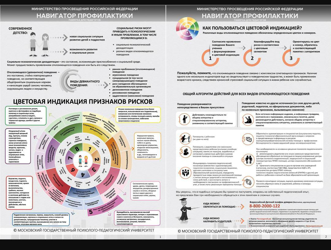В мае-июне 2018 года в рамках реализации Плана первоочередных мер по повышению эффективности профилактики правонарушений обучающихся и обеспечению безопасности образовательных организаций Министерства просвещения Российской Федерации (ранее Министерства образования и науки Российской Федерации) коллективом специалистов факультета Юридической психологии и Центра экстренной психологической помощи МГППУ для педагогов, классных руководителей и других специалистов образовательных организаций разработаны памятки по различным видам девиантного поведения и алгоритмы действий - "Методические материалы по признакам девиаций, действиям специалистов системы образования в ситуациях социальных рисков и профилактике девиантного поведения обучающихся".