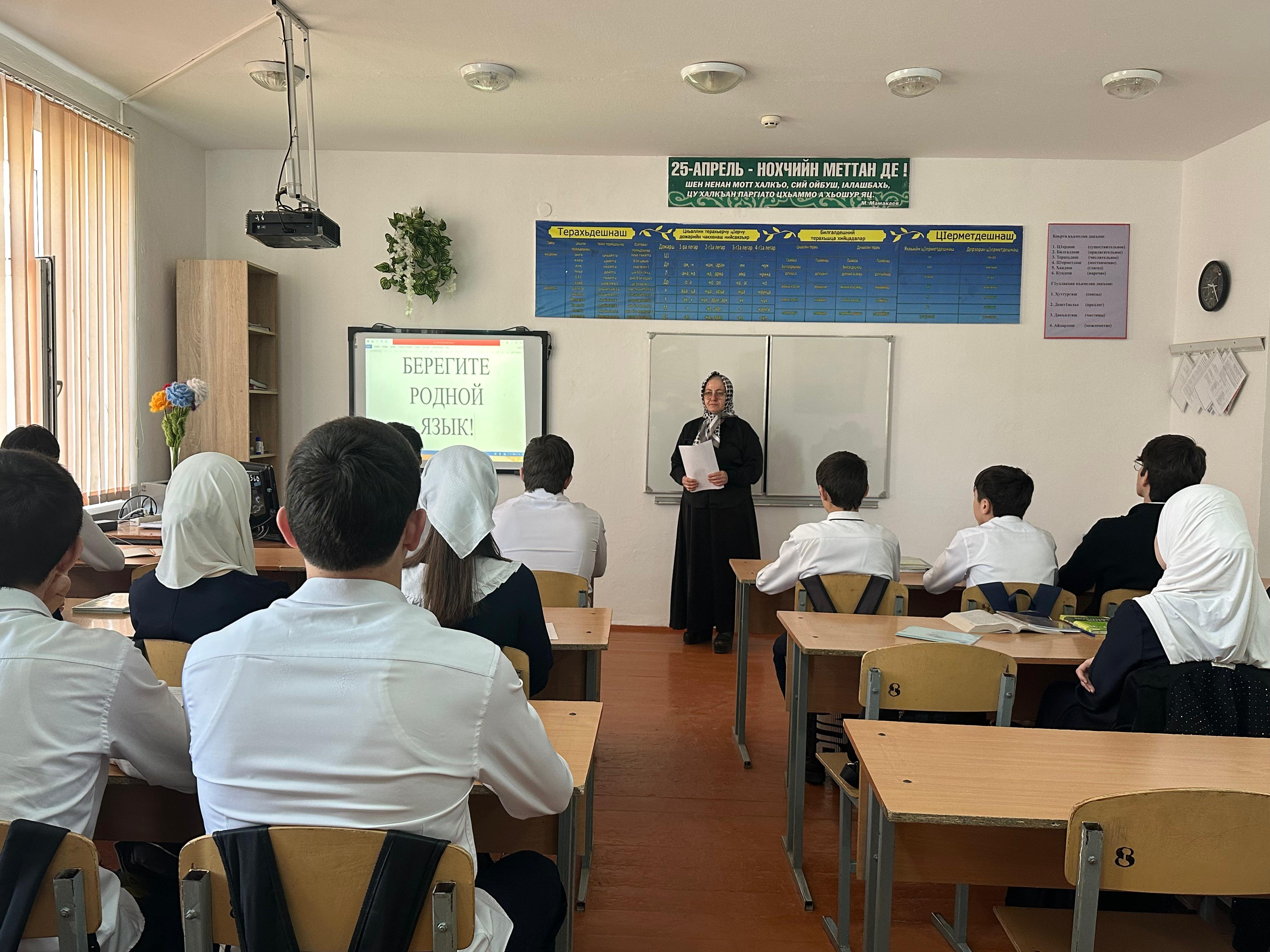 Учителем чеченского языка Усмановой Ш.И. был проведен классный час в 9 классе на тему "Берегите родной язык" . Она рассказала ученикам о том как важно знать и развивать свой родной язык, культуру, традиции. Она познакомила их историей родного языка и подвигах предков для защиты и сохранности нашей нации и языка